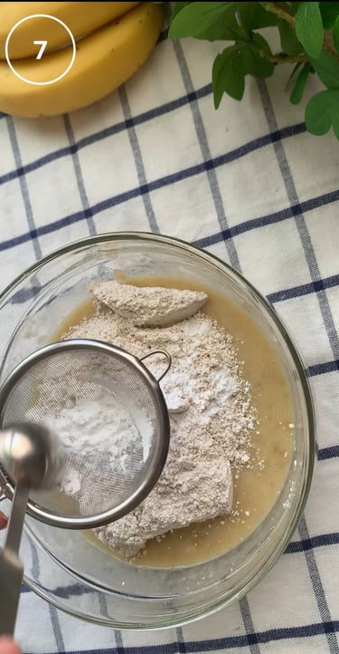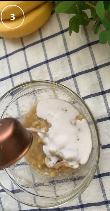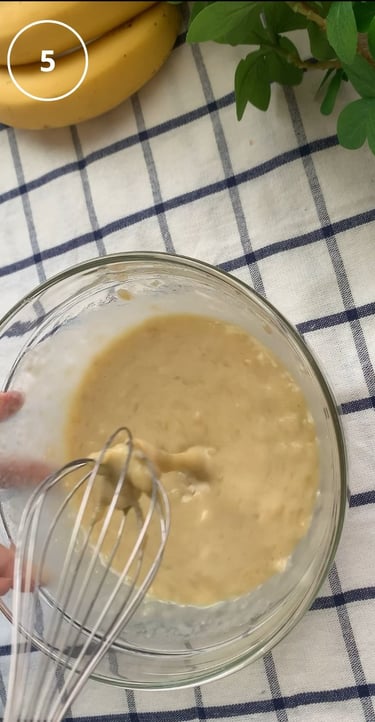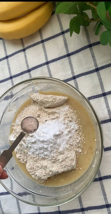 香蕉壓成香蕉泥, 依序加入香草精、豆漿、雞蛋,攪拌均勻, 再依序加入燕麥粉、小蘇打粉(過篩)、鹽巴、檸檬汁、再拌勻。